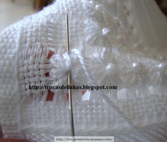 Introduzimos a agulha entre os 03 primeiros fios e laçamos como mostra a foto...